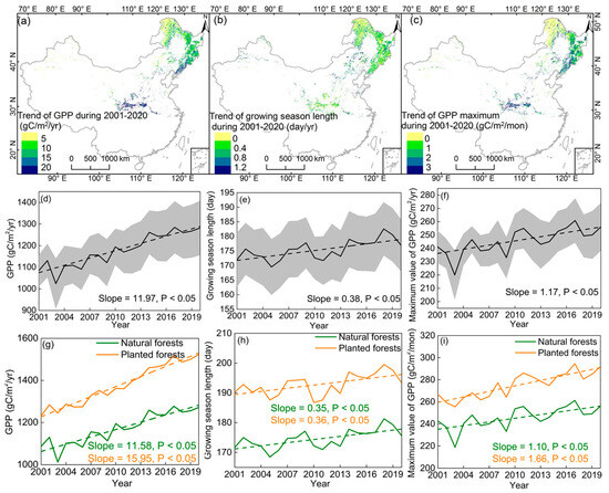 The spatial patterns in the annual gross primary productivity (GPP), growing season length (GSL), and maximum gross primary productivity (GPPmax) trends during 2001–2020 in China’s deciduous forest ecosystems. The spatial patterns in the annual GPP, GSL, and GPPmax trends during 2001–2020 (a–c). The temporal variations in the annual GPP, GSL, and GPPmax trends during 2001–2020 in China’s deciduous forest ecosystems (d–f). The temporal variations in the annual GPP, GSL, and GPPmax trends during 2001–2020 in natural forests and planted forests (g–i). The shaded envelope in panels (d–f) indicates the 95% confidence interval across different forest types.