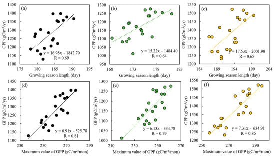 The relationships between the annual gross primary productivity (Black dots: GPP) and the growing season length (Green dots: GSL) and maximum gross primary productivity (Orange dots: GPPmax) in China’s deciduous forest ecosystems (a,d), and across natural forests (b,e), and planted forests (c,f), during 2001–2020.