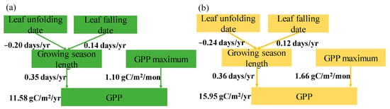 A conceptual framework for the regulation of the growing season length (GSL) and maximum gross primary productivity (GPPmax) in the long-term trend in the annual gross primary productivity (GPP) in natural forests (a), and planted forests (b), for the period 2001–2020. The variation in the GSL was affected by the variation in the leaf unfolding date and leaf falling date. Solid lines indicate significant changes, while dotted lines indicate non-significant changes.