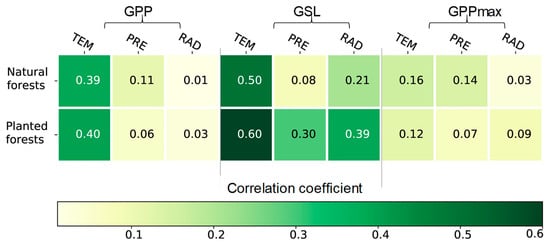 The relationships between the annual gross primary productivity (GPP), growing season length (GSL), and maximum gross primary productivity (GPPmax) and the annual mean temperature (TEM), annual sum precipitation (PRE), and annual sum global radiation (RAD) across natural and planted forests during 2001–2020. Note: the white font indicates p < 0.05.