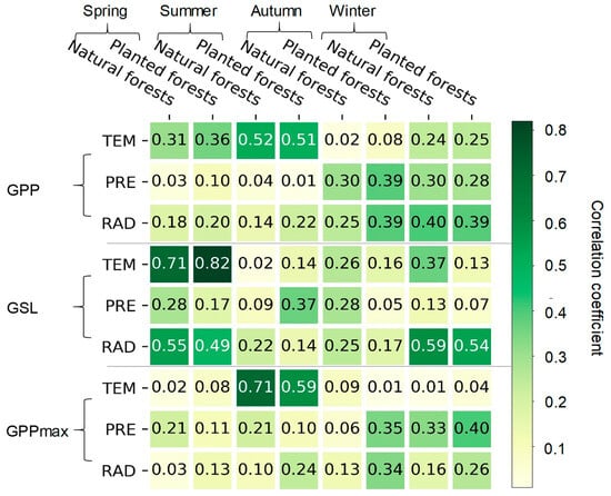 The relationships between the annual gross primary productivity (GPP), growing season length (GSL), and maximum gross primary productivity (GPPmax) and the annual mean temperature (TEM), annual sum precipitation (PRE), and annual sum global radiation (RAD) in different seasons across natural and planted forests during 2001–2020. Note: the white font means p < 0.05.