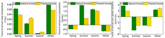 The TEM in natural and planted forests varied significantly during the spring and summer of 2001–2020 (Figure 8a). During 2001–2020, the spring TEM in natural forests experienced a more severe variation than that in planted forests, with a changing rate of 0.51 °C/yr and 0.38 °C/yr, respectively (Figure 8a). Nonetheless, the TEM in summer experienced a more obvious increase in planted forests than in natural forests (0.02 and 0.03 °C/sea, respectively; p < 0.05; Figure 8a). The PRE experienced an apparent increase in the autumn during 2001–2020, while the PRE in other seasons did not increase significantly (Figure 8b). The RAD also experienced a significant increase in winter from 2001 to 2020, but the RAD in other seasons did not increase significantly (Figure 8c).