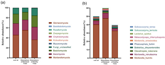 Relative abundance of fungal phyla (a) and the top 10 most abundant fungal species (b) in rhizosphere soil of healthy and diseased trees.