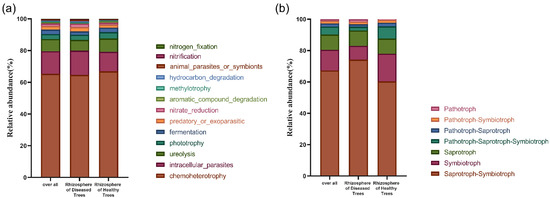 Relative abundance functional groups of bacteria (a) and fungi (b) in rhizosphere soil of healthy and diseased trees.