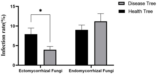 The infection rate of ectomycorrhizal and endophytic mycorrhizal fungi in healthy and diseased trees. Bar shows mean with standard error (n = 90), * p < 0.05.