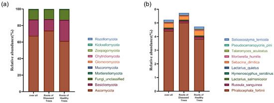Relative abundance of fungal phyla (a) and the top 10 most abundant fungal species (b) in fine roots of healthy and diseased trees.