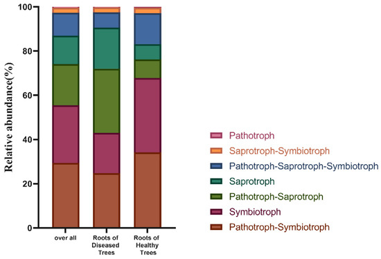 FUNGuild analysis showing predicted trophic mode in fine roots of healthy and diseased trees.