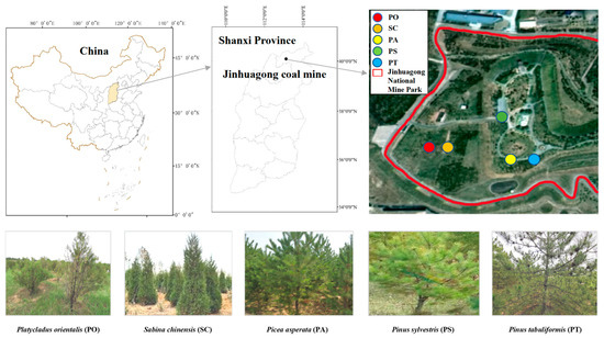 The research area is located in Jinhua Palace National Mine Park (40°10′ N, 113°13′ E), which is located in Datong, northern Shanxi province, China (Figure 1). This area is situated on a reclaimed coal mining site. This region has a temperate continental semi-arid monsoon climate. The mean annual temperature is 6.5 °C, and the mean annual precipitation is 400 mm, with 70% of the annual precipitation occurring between June and September. Chestnut soil, which is categorized as Arenosols by the FAO/UNESCO soil classification system, characterized by its low organic matter content and poor structure, predominated in the study area [4,5]. This soil type can be well restored by artificially forest vegetation, including conifer trees [4]. Therefore, five coniferous tree species were planted in the reclaimed coal mining area in 2005, including Platycladus orientalis (PO), Sabina chinensis (SC), Pinus sylvestris (PS), Picea asperata (PA) and Pinus tabuliformis (PT) (Figure 1). The distance between the plots was over 6 m and the spacing of the samplings was 3 m × 3 m. Three repeated plots of 10 m×10 m were set for each vegetation restoration type.