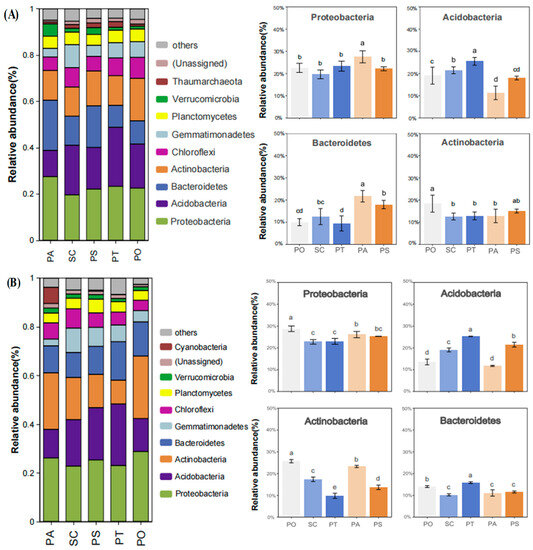 The composition and structure of the bacterial community in bulk and rhizosphere soils for five tree species were elucidated in this study by high-throughput sequencing analysis; a total of 91,713 high quality sequences were obtained. The dominant community groups were Proteobacteria (19.6%–28.8%), Acidobacteria (11.3%–25.5%), Bacteroidetes (9.5%–21.7%), Actinobacteria (9.8%–25.7%), Chloroflexi (4.29%–9.04%), Gemmatimonadetes (2.78%–10.06%), Planctomycetes (3.96%–5.65%), Verrucomicrobia (1.22%–5.32%), Thaumarchaeota (0.86%–2.47%) and Cyanobacteria (0.04%–6.65%); the remaining samples consisted of rare community groups (Figure 2). Tree species, soil, and tree species by soil all presented significant effects on the four most dominant phyla: Proteobacteria, Acidobacteria, Bacteroidetes and Actinobacteria (Table S1). The results indicated that there were significant differences present in the bulk and rhizosphere soils for the four most dominant phyla, e.g., the average relative abundances of Proteobacteria and Actinobacteria in the rhizoshpere soil were 25.2% and 17.9%, respectively, which were higher than those in the bulk soil (23.0% and 14.3%, respectively), and the average relative abundances of Acidobacteria (18.2%) and Bacteroidetes (12.5%) in the rhizoshpere soil were lower than those in the bulk soil (23.0% and 14.3%, respectively) (Figure 2). Furthermore, significant differences in the four most dominant phyla were also observed among the different tree species in both the bulk and rhizosphere soil samples (Figure 2A,B). For example, PA significantly enriched the relative abundances (p < 0.05) of Proteobacteria and Bacteroidota in the bulk soil compared to the other tree species; and PT and PO significantly enriched the relative abundances of Acidobacteria and Actinobacteria (p < 0.05) in the bulk soil, respectively, compared to the other tree species (Figure 2A).