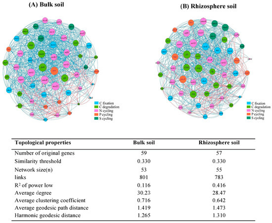 A total of 53 gene nodes and 801 edges were discovered by functional molecular ecological networks in the bulk soil, which was comparable to the rhizosphere soil (55 gene nodes and 783 edges) (Figure 3). The result implies that the correlation between the functional genes presents no significant difference in the bulk and rhizosphere soil samples. The average degree of networks was 30.23 and 28.47 for the bulk and rhizosphere soils, respectively, suggesting the presence of a slightly more complex network in the bulk soil. Moreover, most genes were positively (blue edges) connected with each other in both the bulk and rhizosphere soil samples (Figure 3), suggesting that artificially forest vegetation restoration activity could promote the cooperative behavior of microbial functional communities.