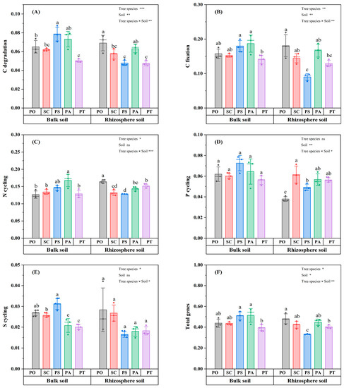 Additionally, for C-cycling genes, both total C-degradation and C-fixation genes for PS and PA were observed to be significantly higher than the PT present in the bulk soil. However, PO and PA showed significantly higher values than PS in the rhizosphere soil (Figure 4A,B), which showed a trend similar to the total genes for different tree species. Significantly higher values for the total N-cycling genes were also observed for PA, compared to the other tree species in bulk soil; however, PO was significantly higher (p < 0.05) than the other tree species in the rhizosphere soil (Figure 4C). There were no statistical differences in total P-cycling genes among the tree species in bulk soil (Figure 4D). For total S-cycling genes, PS and PO had significantly higher values than PA and PT in the bulk soil; however, there were no statistical differences among tree species in the rhizosphere soil (Figure 4E). Meanwhile, the dissimilarity test showed that the structure of functional genes was highly changed among the tree species in both the bulk and rhizosphere soils, based on three analytical methods (Table 4).