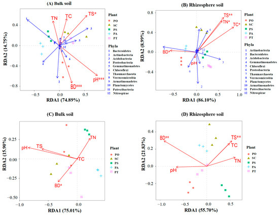 Redundancy analyses (RDA) between environmental factors (red arrows) and microbial composition at the phylum level (relative abundance > 0.1%, blue arrows) in bulk soil (A) and rhizosphere soil (B), and between environmental factors (red arrows) and C, N, P and S functional genes (based on gene data) in bulk soil (C) and rhizosphere soil (D). Significant differences were identified by the Monte Carlo permutation test, * p < 0.05, ** p < 0.01, *** p < 0.001.