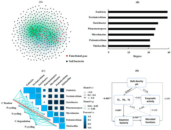 Co-occurrence pattern between microbial community at the genera level and functional genes involved C, N, P and S cycling, the connections represent a strong Pearson’s correlations (|r| > 0.72 and p < 0.05), nodes in red and black are functional gene and soil bacteria, respectively (A). Connectivity of key bacterial genera. Five key bacterial genera were selected according to their close association with functional genes (B). The correlation between key bacterial genera and functional gene groups was determined by mantel test (C). The structural equation model (SEM), continuous and dashed arrows indicate positive and negative relationships, respectively. The standardized path coefficients are adjacent to the arrows (D). * p < 0.05, ** p < 0.01, *** p < 0.001.