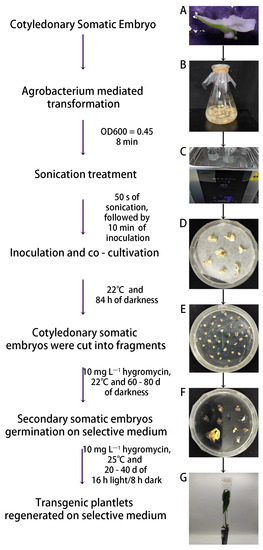 - Udayabhanu, J.; Huang, T.; Xin, S.; Cheng, J.; Hua, Y.; Huang, H. Optimization of the Transformation Protocol for Increased Efficiency of Genetic Transformation in Hevea brasiliensis. Plants 2022, 11, 1067. [Google Scholar] [CrossRef]