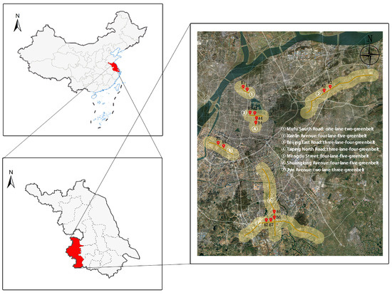 Nanjing City is situated in eastern China, at the lower reaches of the Yangtze River (31°14′ N—32°37′ N, 118°22′ E—119°14′ E). It is geographically located in a narrow north–south and east–west direction [29]. The southern part of the city features low mountains, hills, river valleys, lakeside plains, and riverbanks, collectively forming a diverse landform system. According to the Köppen and Geiger climate classification system, Nanjing City falls into the subtropical dry climate (Cfa) category. This region experiences four distinct seasons, characterized by hot and arid summers, cold and dry winters, and a relatively uniform distribution of precipitation. The annual average temperature stands at 15.4 °C, with the highest recorded temperature reaching 39.7 °C and the lowest dropping to −13.1 °C. Abundant precipitation, with an annual rainfall of 1200 mm, creates favorable conditions for vegetation growth and agricultural activities. Based on a comprehensive survey of all the roads in Nanjing, seven roads were selected for further investigation, representing five major urban areas encompassing Jianye District, Xuanwu District, Gulou District, Qixia District, and Jiangning District. The green space along these roads consists of various plant configurations, including arbors, shrubs, and grass, spanning different road grades and directions. The research scope encompasses both downtown and urban fringe areas (Figure 1). This research primarily investigates the number of lanes, the shape of green belt sections, the plant configuration, and the specific species of plants.