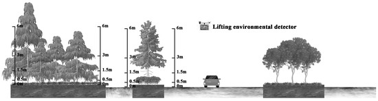 Based on surveys of traffic volume on daytime and nighttime roads and the relevant literature [30,31,32,33,34,35], monitoring was conducted at three time periods: 7:00–9:00, 12:00–14:00, and 17:00–19:00, representing morning peak, off-peak, and evening peak hours, respectively [36]. In each monitoring area of the road green space, from three to four transverse observation points perpendicular to the road were established, including one observation point in the motor vehicle lane, two in the non-motor vehicle lane, and one located behind the green belt (Figure 2) [37]. Meteorological data and gas pollutant concentrations were monitored at various heights (0 m, 0.5 m, 1.5 m, 3 m, and 6 m) using a lifting pole at each observation point. Measurements were taken for 1–3 min at each position and height, and the recorded data were averaged. Simultaneously, counters were utilized to capture the traffic volume within a five-minute time limit on the road and categorize the counts based on the types of vehicles, including trucks, buses, and electric vehicles.