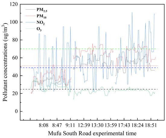 Overall, the concentrations of various pollutants on Mufu South Road increase as the traffic volume increases throughout the day (Figure 3). The pollutant concentration in Nanjing City is relatively low and generally complies with the National Air Quality Standards Grade II [38]. However, there are specific disparities compared to the interim target–4 in the Air Quality Guidelines released by the World Health Organization (dotted line in Figure 3) [39]. The average daily concentration of NO2 detected at Mufu South Road was 60.4 µg/m3, which is below the National Air Quality Standards Grade II limit of 80 µg/m2. However, the average daily concentration of NO2 in the Air Quality Guidelines interim target-4 is 50 µg/m3. Specifically, the concentration of various air pollutants was significantly lower during the morning peak hours compared to the non-peak hours at noon and the evening peak hours. As shown in Figure 4, the findings demonstrate a robust positive correlation between the concentration of NO2 and the traffic volume. However, no correlation was observed between O3 concentration and traffic volume. The concentrations of inhalable particles (PM2.5 and PM10) were lower during the morning peak hours, while no significant differences were observed during the non-peak and evening peak hours. The concentration of NO2 generally showed a positive correlation with traffic volume, whereas the relationship between other pollutants and traffic flow was less apparent. These findings indicate that meteorological factors may influence the concentration fluctuations of inhalable particles and pollutants such as O3 on roads.
