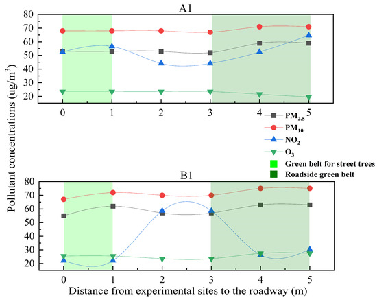The plant configuration at the experimental site on Mufu South Road comprises grass (A1) and arbor–shrub–grass (B1) (Table 5, Figure 5). The arbor–shrub–grass green spaces exhibited a slight increase in the concentrations of the PM2.5, PM10, and O3 pollutants and a moderate reduction in NO2 gas concentration. All four pollutants showed a slight upward trend in concentrations within the grass plant configuration pattern.