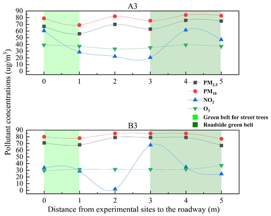 The plant configuration at the experimental site on Beijing East Road consists of square (A3) and arbor–grass (B3) (Table 5, Figure 6). While the arbor–grass green space had a certain influence on reducing NO2 concentrations, its effectiveness in removing the PM2.5, PM10, and O3 pollutants was relatively limited. The square exhibited limited capacity to reduce all four pollutants.