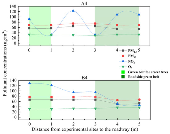 The plant configuration at the experimental site on Taiping North Road is characterized by arbor–shrub (A4) and arbor–shrub–grass (B4) (Table 5, Figure 7). The results revealed that the arbor–shrub–grass green space showed notable pollutant reduction, with NO2 showing a particularly high reduction rate of 69.57%. While NO2 concentrations exhibited significant variation within the arbor–shrub green space, the reduction effect on all pollutants was not significant.