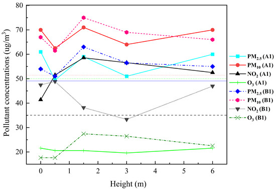Pollutant concentration variation at different heights for experimental sites A1 and B1 on Mufu South Road.