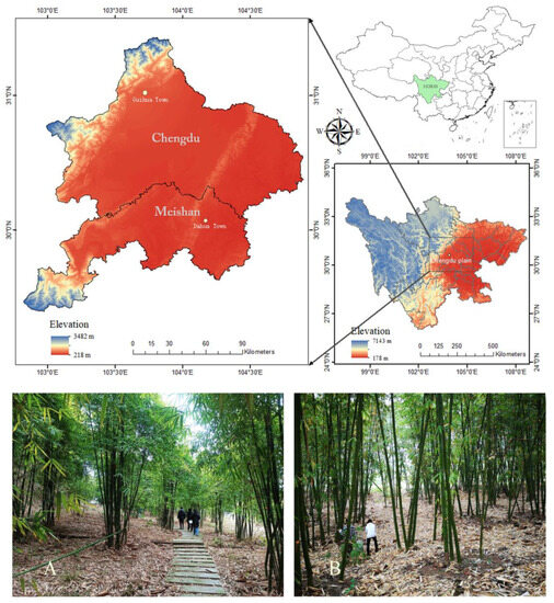 The location and the bamboo forests: (A) Neosinocalamus affinis forest; (B) Dendrocalamus latiflorus forest.