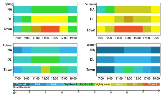 Based on the measured temperature, relative humidity, wind speed, and solar radiation intensity, the PET values were calculated for each period at each site using RayMan software by the Meteorological Institute at Freiburg University, and the corresponding thermal comfort perceptions were derived from the model intervals of PET thermal sensation and physiological stress levels. The overall physiological indexes were set as follows: male; 35 years old; height, 175 cm; weight, 75 kg; average metabolic rate, 80 W. According to the local climate and dress, the thermal resistance of clothing was 0.8 clo in spring and autumn, 0.5 clo in summer, and 2.0 clo in winter.