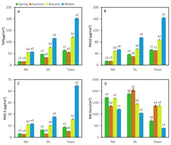 The total suspended particulate (TSP) concentrations were significantly lower (p < 0.05) in all four seasons in the NA bamboo forest and DL forest than in the control in all four seasons (Figure 3A). The TSP concentrations in both bamboo forests were significantly lower in spring and summer than in autumn and winter (p < 0.05). It is noteworthy that the TSP concentrations in the NA forest were significantly lower than those in the DL forest in all seasons (p < 0.05). The seasonal differences and seasonal variation in coarse particulate matter (PM10) and fine particulate matter (PM2.5) between the two bamboo forests were consistent with those of the TSP (Figure 3B,C).