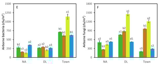 Airborne bacterial levels were significantly lower (p < 0.05) in both bamboo forests than in town open spaces in all seasons, indicating that bamboo forests have a significant bactericidal effect (Figure 3E). The airborne bacterial content was significantly lower in summer and autumn (p < 0.05) than in spring and winter in the NA forest, while that in autumn was significantly lower (p < 0.05) than that in the other three seasons in the DL forest. The airborne bacterial content of the NA forest was significantly lower than that of the DL forest in summer (p < 0.05), but the opposite was true in winter. There was no significant difference between the other two seasons. The airborne fungal content in the bamboo forest was very different from the airborne bacterial content (Figure 3F), with only the summer airborne fungal content of both bamboo forests being significantly lower (p < 0.05) than that of the town open space. In spring and winter, the airborne fungal content in the bamboo forests was significantly higher (p < 0.05) than that in the control. However, the airborne fungal content of the NA forest was significantly lower than that of the DL forest in spring, summer, and autumn (p < 0.05).