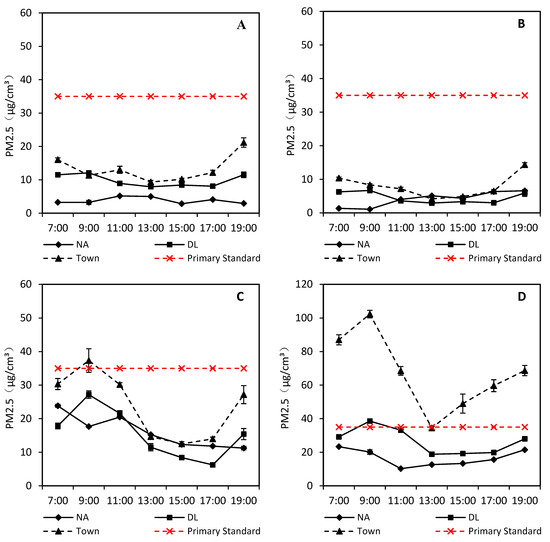 Diurnal variation in PM2.5 in four seasons in two kinds of clustered bamboo forests: (A) spring; (B) summer; (C) autumn; (D) winter; (PM2.5) fine particulate matter concentration; (NA) Neosinocalamus affinis forest; (DL) Dendrocalamus latiflorus forest. The red line is the primary concentration limits of PM2.5 concentration in the recreation area.