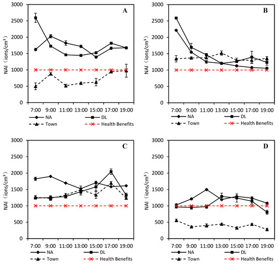 Diurnal changes in the NAI concentrations in four seasons in two kinds of clustered bamboo forests: (A) spring; (B) summer; (C) autumn; (D) winter; (NAI) negative air oxygen ion concentration; (NA) Neosinocalamus affinis forest; (DL) Dendrocalamus latiflorus forest. The red line shows the minimum standard required by the WHO for the concentration of negative oxygen ions in fresh air.