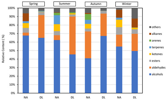 The analysis of the composition and relative contents of biogenic volatile organic compounds (BVOCs) showed that eight types of BVOCs were emitted from the two bamboo forests (Figure 6). The main volatile compounds were alcohols, aldehydes, esters, and ketones. The highest relative contents of alcohols were found in all four seasons in the two clustered bamboo forests. The relative contents of alcohols in the four seasons were 66.85% (spring), 61.70% (summer), 40.58% (autumn), and 53.90% (winter) in the NA forest and 64.61% (spring), 43.04% (summer), 66.22% (autumn), and 48.5% (winter) in the DL forest. The next most abundant compounds in the DL forest across the four seasons were aldehydes, with relative contents of 26.51% (spring), 42.04% (summer), 25.86% (autumn), and 19.72% (winter). The next most abundant compounds in the NA forest were alkanes (9.07%) and terpenes (10.37%) in the spring and summer and aldehydes in the autumn (31.17%) and winter (13.75%).