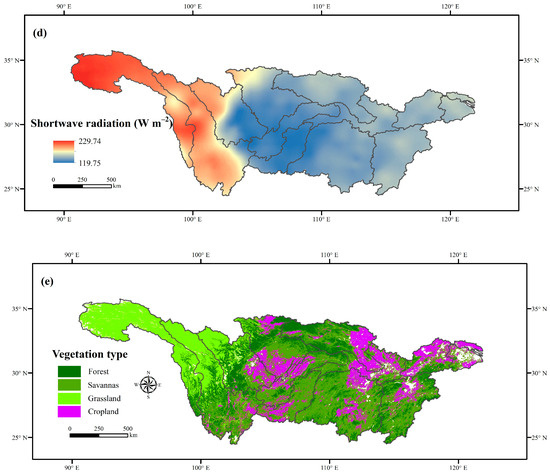 The YRB exhibits a typical subtropical monsoon climate, with a decline in both temperature and precipitation from the southwest to the northwest. The average annual temperature varies from 12.6–28.3 °C, and the annual precipitation varies between 500 to 2500 mm [42,43,44]. The distributions of precipitation, temperature, and shortwave radiation of the YRB during 2000–2018 were shown in Figure 1b–d. It can be observed that precipitation and temperature in the YRB both exhibited decreasing patterns from the upper reaches to the lower reaches (from northwest to southeast). This is particularly evident in the lower reaches of the Yangtze River, where precipitation is often greater than 500 mm. However, the shortwave radiation showed the opposite pattern, with a decreasing trend from the upper reaches to the lower reaches.