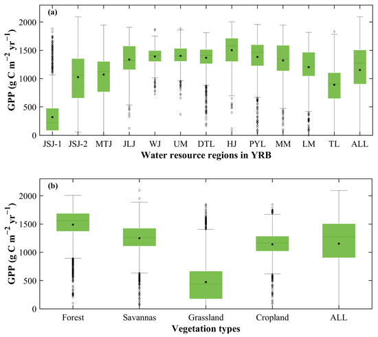 Boxplot of the variations of GPP in different water resource regions (a), and vegetation types (b) in the YRB. Boxplot elements: square points = mean values; horizontal lines within boxes = medians; whiskers = 1.5 times of interquartile ranges; and points outside the boxes = outliers.