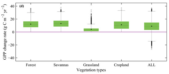 We analyzed the GPP variations in different vegetation types (Figure 3b). Results showed that forests had much higher GPP values, with an average of 1476.9 ± 287.3 g C m−2 yr−1, followed by savannas and cropland, with GPP averages of 1345.7 ± 274.2 g C m−2 yr−1 and 1130.4 ± 246.2 g C m−2 yr−1, respectively. Grassland had much lower GPP values with an average of 469.0 ± 354.3 g C m−2 yr−1.
