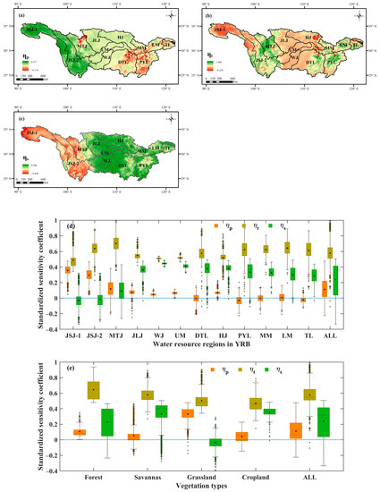 The spatial distributions of (a), (b) and (c) in the YRB. Histograms of , , and in 12 water resource regions (d) and vegetation types (e).