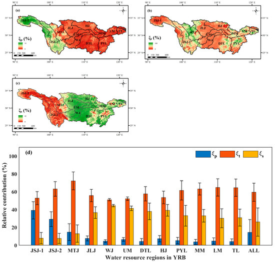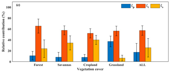 In the YRB, 72% of the areas had positive values, indicating that in most regions GPP increases with increasing precipitation (Figure 6a). The regions that exhibited greater sensitivities to precipitation were primarily located in the upper reaches of the Yangtze River, such as the Jinsha River Basin above Shigu (JSJ-1) and the Jinsha River Basin below Shigu (JSJ-2), with averages of 0.35 ± 0.07 and 0.29 ± 0.08, respectively. The relative contributions of precipitation to GPP in the Jinsha River Basin above Shigu (JSJ-1) and the Jinsha River Basin below Shigu (JSJ-2) regions were significantly higher than that in other water resource regions, with averages of 39.08 ± 9.68% and 29.12 ± 8.34% (Figure 7d). From vegetation type map (Figure 1e), it can be observed that these two water resource regions had significant proportions of grassland, which were 82.75% and 34.87%, respectively. Our results also indicated that grassland was more sensitive to precipitation compared to other vegetation types (Figure 6e). Figure 7e also indicated grassland had much higher than other vegetation types, which was 37.12 ± 9.83%.