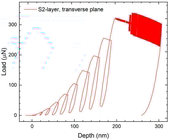 Nanoindentation has proven to be a useful tool to evaluate the micrometer-scale mechanical properties of the S2 layer and compound corner middle lamella (CCML) of the cell walls of different wood species [13,14,15,16,17,18]. In a typical nanoindentation test, a carefully shaped probe is pressed into a sample following a prescribed loading protocol, with which both applied load and displacement are continuously measured [19]. Many indentation tests in wood cell walls include load functions comprising a three-segment loading ramp (loading, holding, and unloading) in which each segment employs at different times. The short period of time aims to reduce the possible effects of plastic deformations in wood on the unloading segment. The step-wise load functions use a force-controlled mode, with maximum forces ranging from 250 μN to 400 μN [13,15,16,20,21,22]. On the other hand, multiload nanoindentation load functions have been developed to measure properties as a function of nanoindentation size in a single location [18]. The multiload functions consist of a series of loading cycles; therefore, a series of nanoindentations is obtained instead of single nanoindentations. Similarly to the single load function, the number of segments per cycle is three [23]; however, a four-segment cycle has also been reported. This includes a final segment to hold the partial unloads before beginning the next cycle [18]. The test can be quasistatic or dynamic. In the quasistatic test, the elastic modulus of a material is obtained from the contact area and initial slope of the unloading segment in a load vs. displacement ( graph, whereas the hardness is calculated from the maximum load and contact area [24]. The calculations assume that during the unloading segment the material has a purely elastic behavior [25].