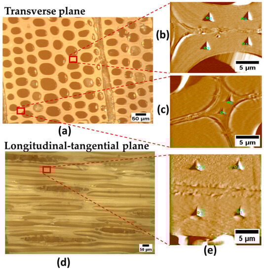 Cutting planes in radiata pine wood. (a) Transverse plane with nanoindentations on (b) S2 layer and (c) CCML, (d) Longitudinal–tangential plane with nanoindentations on (e) S2 layer.