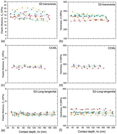 Elastic modulus and hardness of wood cell walls obtained from individual nanoindentations. (a,b) S2 layer in the transverse orientation; (c,d) CCML in the transverse orientation; (e,f) S2 layer in the longitudinal–tangential orientation. Each colored curve represents the complete multiload segment of a nanoindentation.