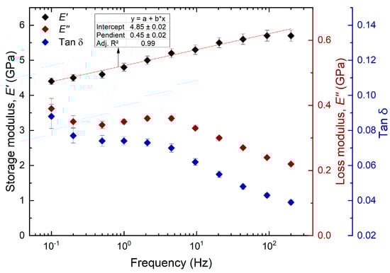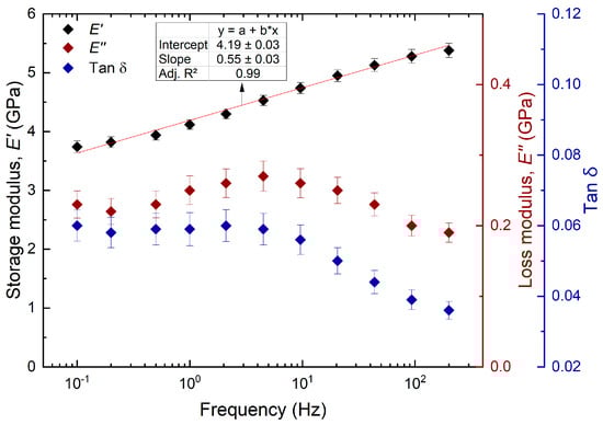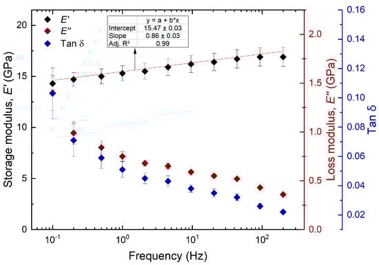 As seen in Figure 5, the increase in the modulus is linear and fits the logarithmic scale of the frequency with an adjusted coefficient of determination of 0.99. The reason for this increase in storage modulus is due to the shorter exposure times (cycle/s) of the material to the load. Therefore, the polymer chains will be able to recover faster, and the amount of stored energy is higher. The polymer chains have minimal movements, and this makes it behave as a rigid material. In contrast to the storage modulus, it is observed that the amount of dissipated energy or loss modulus increases as the frequency decreases, with values from 1.40 GPa for the lowest frequency to 0.36 GPa at 200 Hz. Therefore, it is evident that the material has a stiffer behavior at high frequencies because the viscous response is related to the relaxation time of the material. At high frequencies, the duration of each cycle time is shorter; therefore, there is less time for the chains to relax, begin to move, and reach new conformations in response to the applied stress. Consequently, the viscous response of the material is lost [67]. On the other hand, when wood is subjected to cyclic loading, it loses energy during the deformation process. This loss factor is smaller as the frequency becomes larger, since there is less energy dissipated due to the small molecular movement. Here, the tan decreased from 0.10 at the lowest frequency to 0.02 at 200 Hz. A decrease in tan was also observed by [36,43].