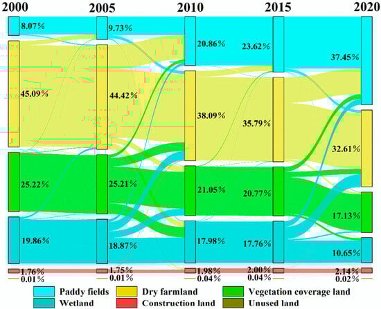| Years | Paddy Fields (PF) | Dry Farmland (DF) | Vegetation Coverage Land (VCL) | Wetland (WET) | Construction Land (CL) | Unused Land (UL) |