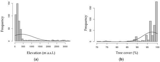 Above-ground biomass data distribution along (a) elevation gradient and (b) tree cover values for the year 2000 based on [49].