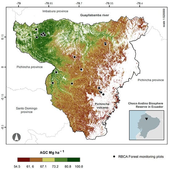 Variation in above-ground carbon density (AGC, Mg C ha−1) at 10 m pixel resolution throughout the Chocó Andino Biosphere Reserve (RBCA for its Spanish acronym) in the western Ecuadorian Andes, derived from an integrated model of remote sensing, local, regional, and global field plot datasets integrated in a random forest algorithm.