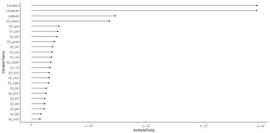 Variable importance in a random forest model based on the Gini impurity index for the Chocó Andino Biosphere Reserve (RBCA for its Spanish acronym).