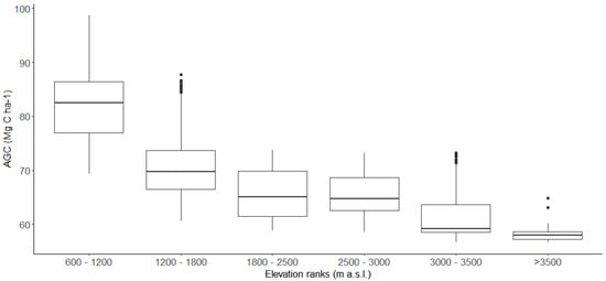 As elevation is the single most important factor controlling AGC stocks in tropical mountain ecosystems [61,62,63], AGC maps were decomposed into six elevation ranks to assess the spatial distribution of the above-ground carbon across the study area. Elevation ranks were set based on natural breaks in the histogram of the elevation grid. We also generated a profile along the elevation gradient and summarised the AGC value per pixel for each elevation rank and generated AGC averages per each rank. Lastly, we compared our AGC model against pre-existing AGC global datasets [19,64,65] across the elevation gradient in the RBCA.