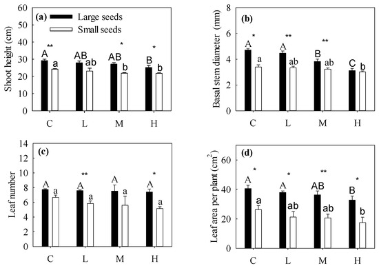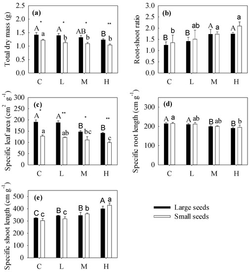 - Stanton, M.L. Seed variation in wild radish: Effect of seed size on components of seedling and adult fitness. Ecology 1984, 65, 1105–1112. [Google Scholar] [CrossRef]