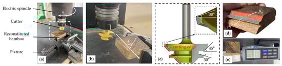 Procedure for milling test of recombinant bamboo. (a) Recombinant bamboo mounted on a fixture. (b) Fiber angle of recombinant bamboo. (c) Structure and angle of the milling cutter. (d) Tangential and normal roughness of the milled surface. (e) Measurement procedure of tangential roughness of milled surface.