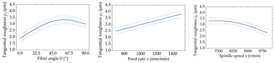 The plot in Figure 3 demonstrates the correlation between tangential roughness μt and the factors. Specifically, the graphical data depicts that the tangential roughness increased and then decreased as the fiber clamp angle was increased. The fiber clamp angle for the highest point was approximately 60°, wherein a smaller fiber angle resulted in lower tangential roughness. However, when the fiber angle was 60°, tangential roughness started decreasing. The optimal fiber clamp angle for maximizing tangential roughness in recombinant bamboo is dependent on the feed direction and spindle rotation direction (this experiment utilized the downstream milling method). Additionally, the tangential roughness increased linearly with a rise in the feed rate, consistent with the alterations of roughness when cutting wood. Furthermore, the tangential roughness declined non-linearly with a higher spindle speed; this reduction accelerated with increasing speed. This reduction trend was basically similar to the roughness changes observed when milling wood.