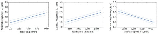 The relationship between the normal roughness μn and the factors is depicted in Figure 4. From the graph, it is evident that the normal roughness increased in a linear fashion as the fiber angle increased. This observation implied that the surface formed by isotically cutting (θ = 0°) bamboo fibers is smoother, compared to the surface formed by transversely cutting (θ = 90°) bamboo fibers. Furthermore, Figure 5 shows that the normal roughness exhibited a linear increase with an increase in feed rate and a decrease in spindle speed. This finding aligned with the conclusions drawn from our previous studies on the circumferential milling performance of wood [].